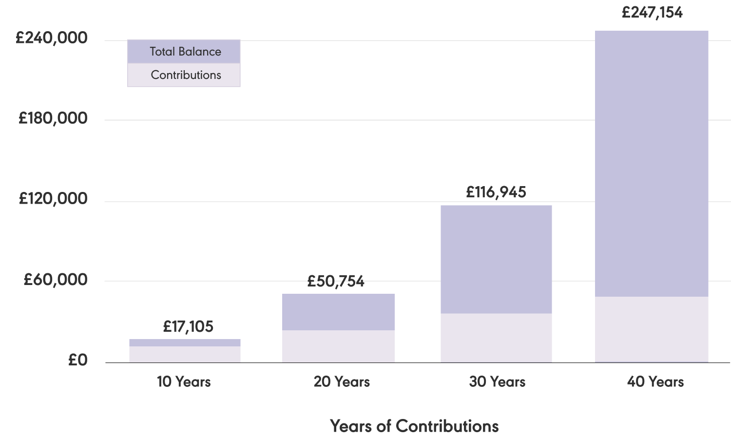 Figure demonstrates £100 monthly contributions, compounding annually at a rate of 7%, 10 years apart over 40 years.