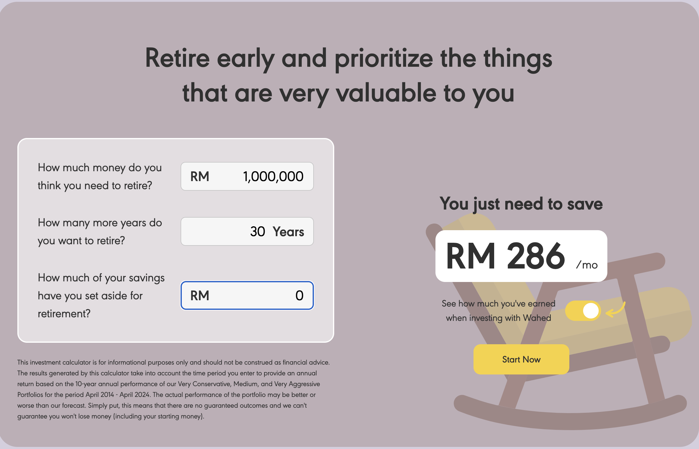 Set a financial goal with Wahed — whether it's for a laptop, a holiday, or a down payment on a house. Small, consistent investments now will set you up for bigger rewards later. Try out this calculator to see the impact of compounding where you can reach the target of RM 1 million not with RM 2,777 per month, but just with RM 286.
