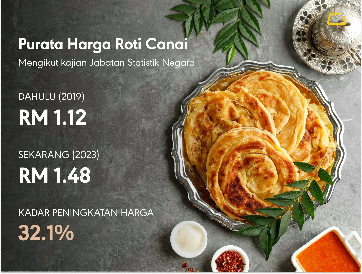Harga roti canai pada 2019 hanya RM 1.12, namun kini harganya meningkat sehingga RM 1.48 pada akhir tahun 2023. Ini merupakan inflasi sebanyak 32% atau 6.43% setiap tahun. Sama juga seperti nasi lemak, harganya pada tahun 2019 cuma RM 2.78 tetapi kini, harganya meningkat sehingga RM 3.54 di 2023. Inflasi nasi lemak menunjukkan kenaikan 27% atau 5.4% setiap tahun.