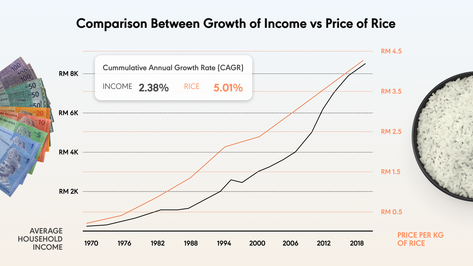 You might think that an increase of RM0.55 is just pocket change. However, in percentage terms, that’s an 11% increase in just three years! All the while you might ask, did you get a salary increment of 11% in the past 3 years just so that your nasi lemak remains decently priced (to you)? — perhaps this time with all things being equal, you get less than what you pay for (with one less egg and a few fewer pieces of anchovies.)