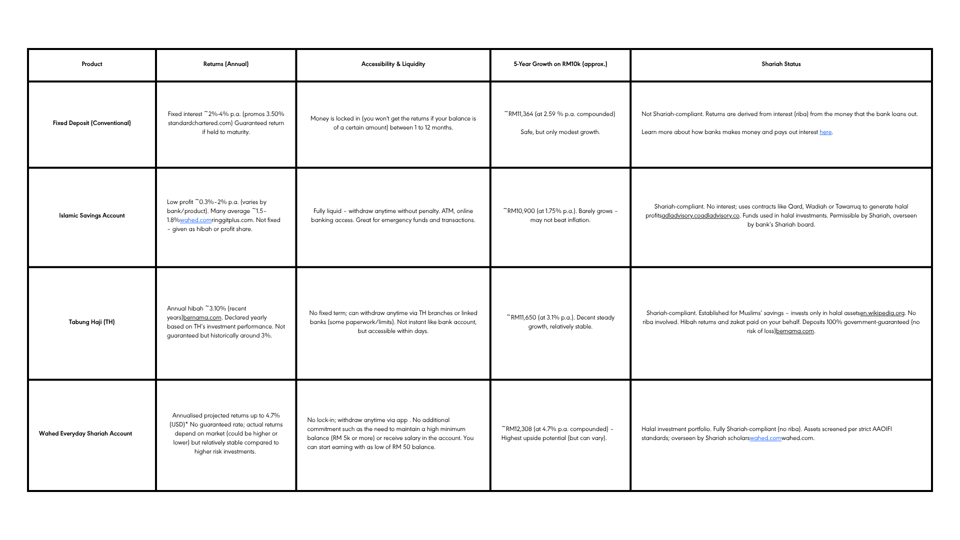 Let’s illustrate how your money could grow (or not) over 5 years in each product, assuming a starting amount of RM10,000 and today’s typical rates/returns. This will show the power of compounding and why “settling for less” can be costly in the long run.