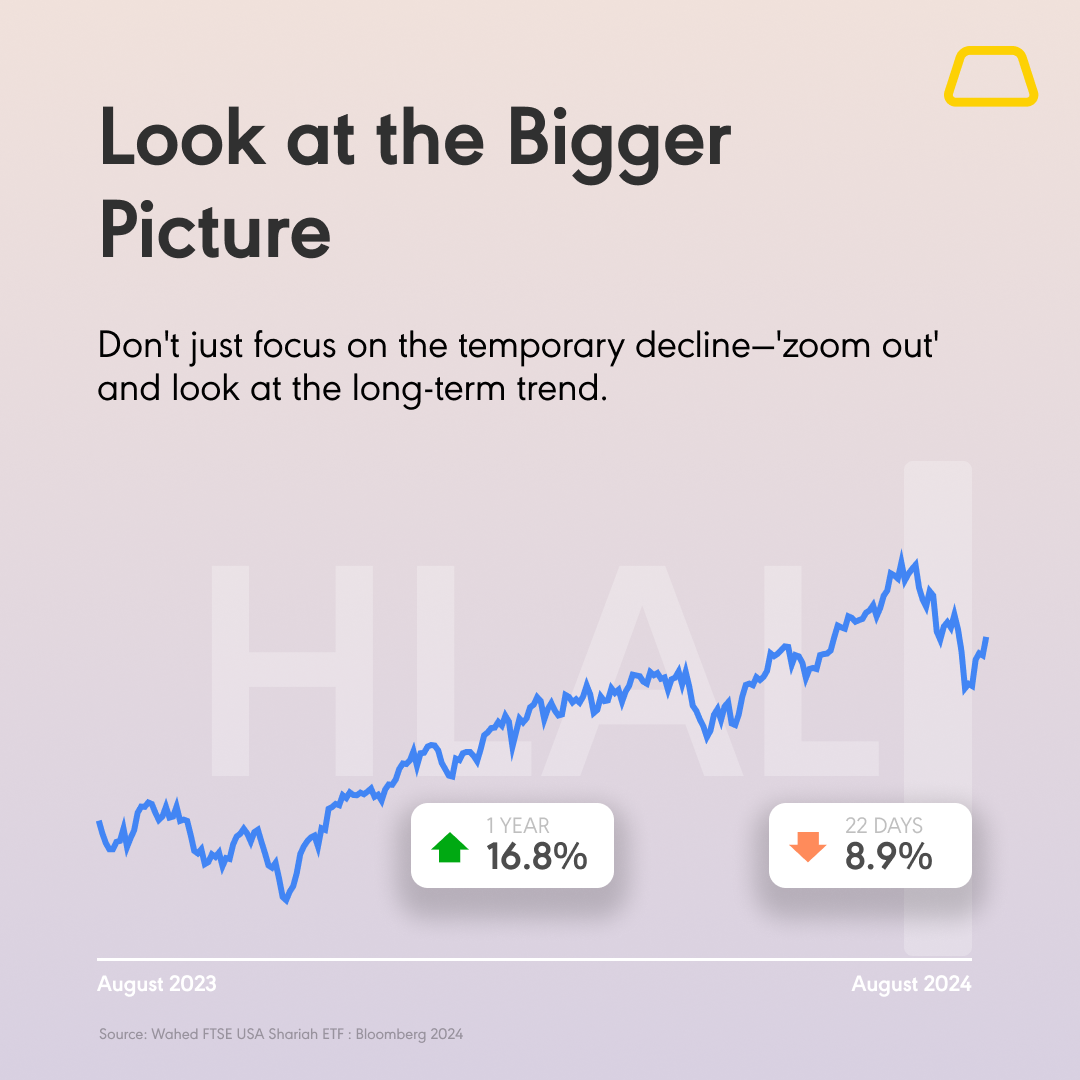 Don't just focus on the temporary dip — zoom out and look at the long-term trend. For example, although the Wahed FTSE USA Shariah ETF (HLAL) recently experienced an 8% decline1, a broader view shows a 15% increase over the past year2. This reminds us to always keep our focus on the bigger picture.