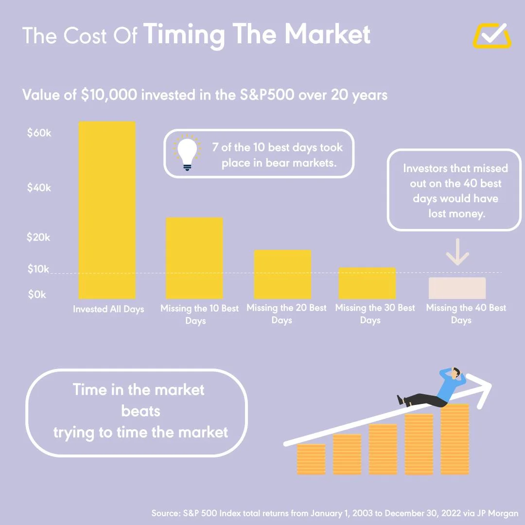 Over a 20 year period in the S&P500, if you missed 10 of the best days in the market, your returns would be half that of someone who stayed invested the whole time. The numbers get bleaker and bleaker as you miss more of the best days.