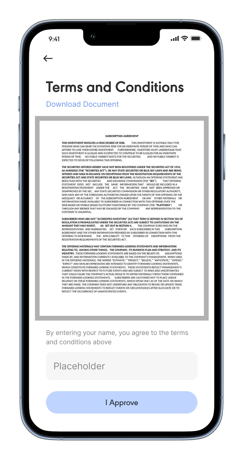 After accepting the terms and conditions, the Subscription Agreement will open for your review. This document outlines the legal terms of your investment and confirms your intent to purchase shares in the investment structure.