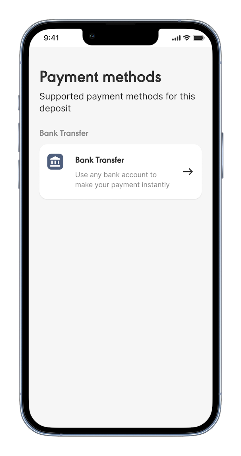 Once you confirm the amount, you’ll be taken to the Payment Method screen. You’ll see Bank Transfer as the available method. Select it to proceed.